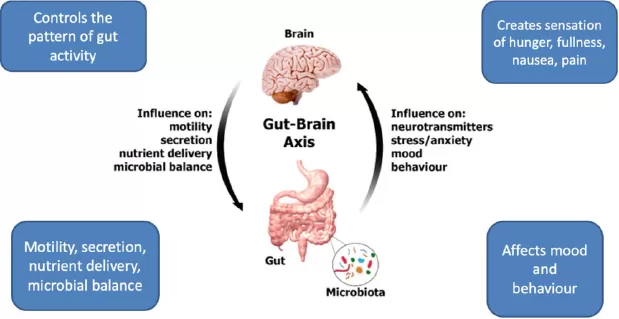 - from the gut to the brain creating sensations of hunger, fullness, nausea, pain, all of which can affect mood and behaviour