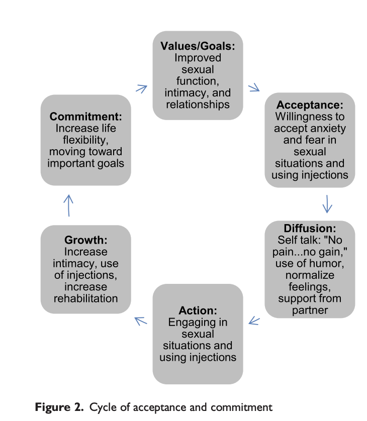 As physiotherapists, we find that as men’s incontinence improves, their attention will turn to addressing their ED. They may have been provided with instructions from their Urologist, Urology Nurse or Prostate Cancer Specialist Nurse about PDE5i inhibitors, vacuum pump or injections. We certainly see men in this avoidance cycle and find using the cycle of acceptance and commitment above to be a helpful communication tool to increase engagement with these therapies.