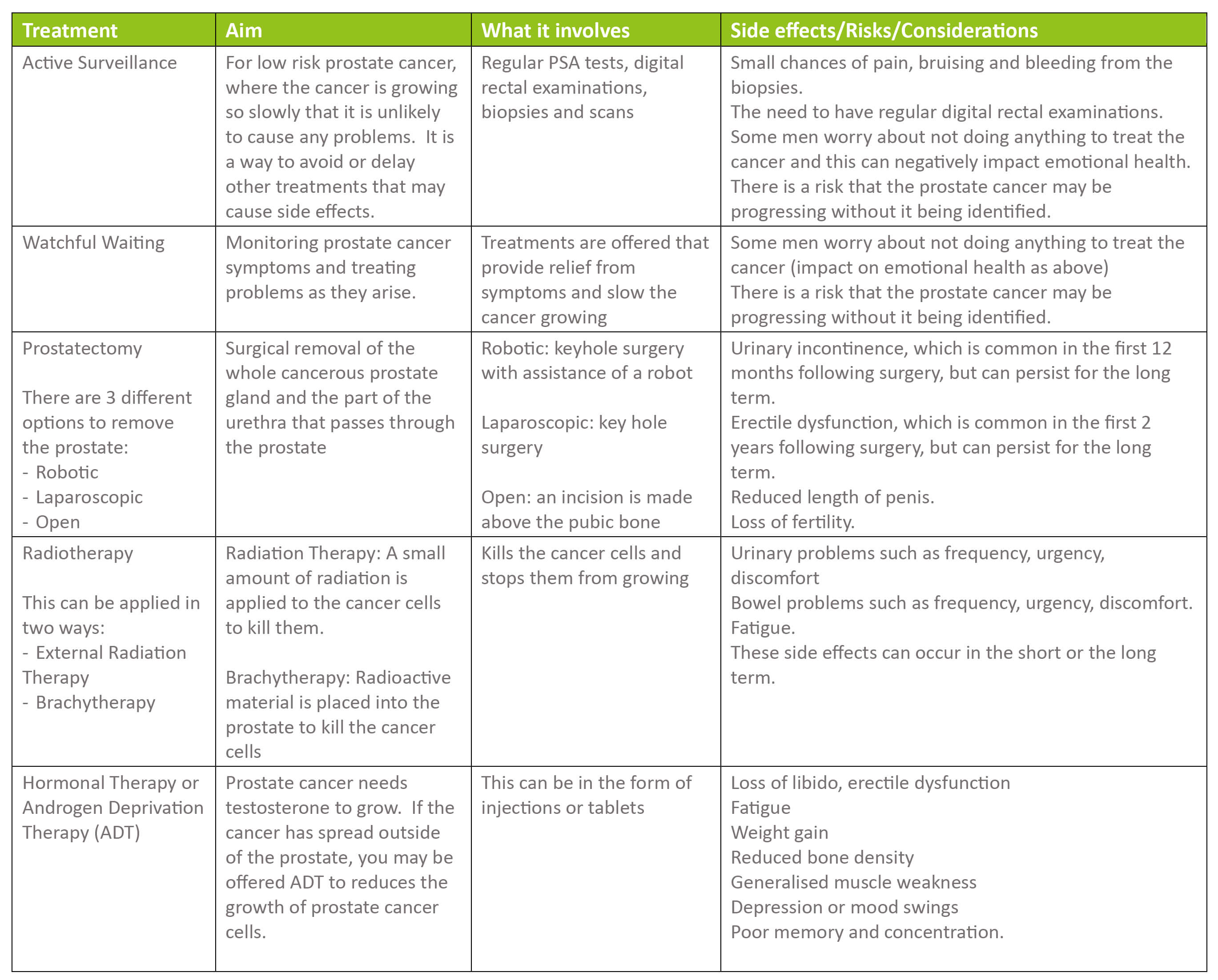 As you can see from the table below, the treatments of prostate cancer all come with significant side effects that have the potential to impact quality of life. The different options for prostate cancer treatment include: