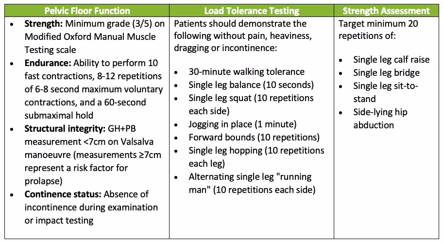 While no studies specific to postnatal populations have evaluated exercise readiness, this framework represents best practice by focusing on functional ability rather than arbitrary timelines. Though primarily valuable for pelvic health physiotherapists, these assessment criteria provide useful guidance for all practitioners supporting postpartum women's safe return to high-impact exercise.
