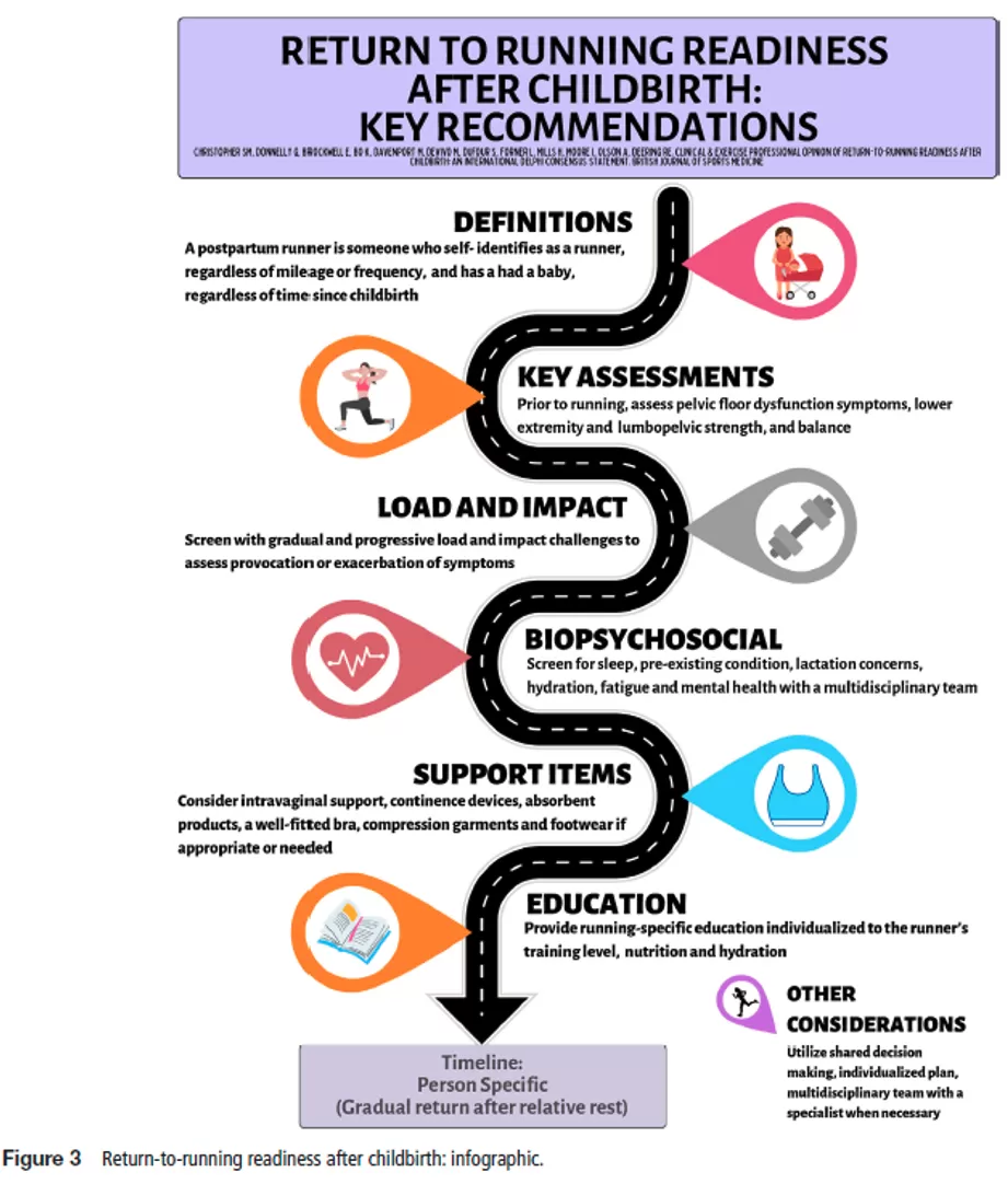 This framework serves as a valuable tool for healthcare professionals to understand the unique post-natal considerations when returning to running, promoting a proactive approach to postnatal care. In 2020 the same group published a lovely info-graphic to share this information in an easy to read digestible format.5