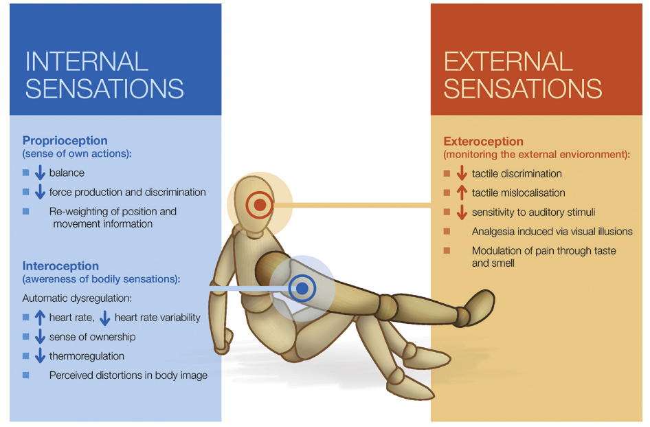 We now have growing evidence that persistent pain conditions have an associated central pathology involving cortical re-organisation, altered neural processing and an incongruence between expected and actual sensorimotor feedback. In a fascinating review of the subjective appraisal of body representation in people with persistent pain, Tsay3 et al examine the overlap of three broad sensory systems; proprioceptive information, exteroceptive stimuli and interoceptive awareness. They provide an overview of the literature that implicates distorted mental body representation in the presence of persistent pain as shown in this diagram and provide evidence for a multisensory and multimodal approach to therapies.
